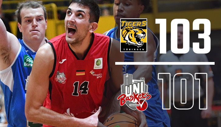 Die Uni Baskets haben ihr zweites Auswärtsspiel in der BARMER 2. Basketball-Bundesliga Saison 2020/21 trotz zwischenzeitlicher 11-Punkte-Führung in allerletzter Sekunde verloren: Bei den Tigers Tübingen verloren die Paderborner vor Corona-bedingt nur 400 zugelassenen Zuschauern nach einer dramatischen Schlussphase durch einen Buzzer Beater von Tübingens Troy Simons mit 101:103 (51:48). Baskets-Headcoach Steven Esterkamp zeigte sich enttäuscht:...Read More